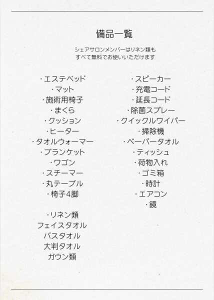 リネン(大判タオル、バスタオル、フェイスタオル、ガウン類)もシェアサロン代に含まれています。