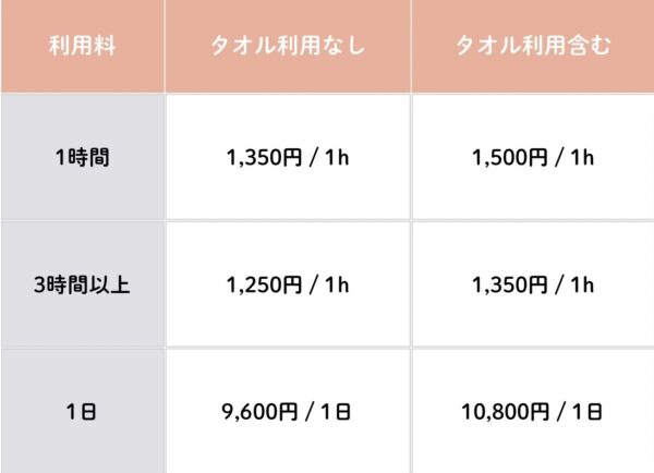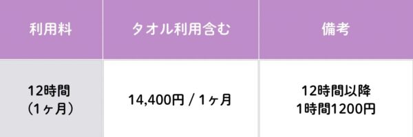 月額14400円で12時間ご利用分が含まれます(タオル類のご利用も含まれます)  ※12時間以上は1時間1200円です。
